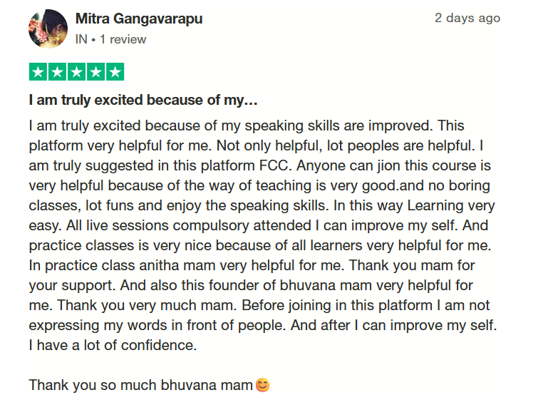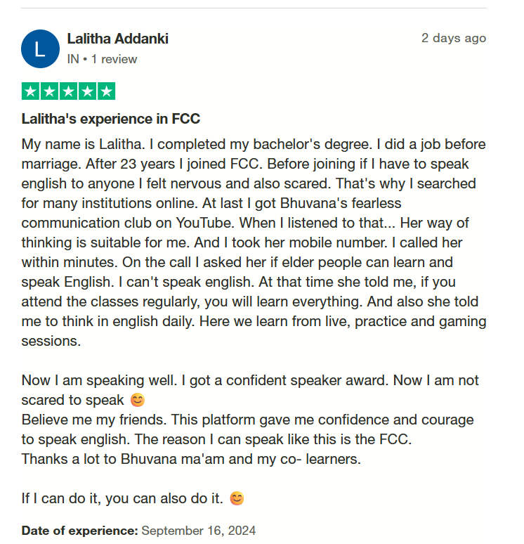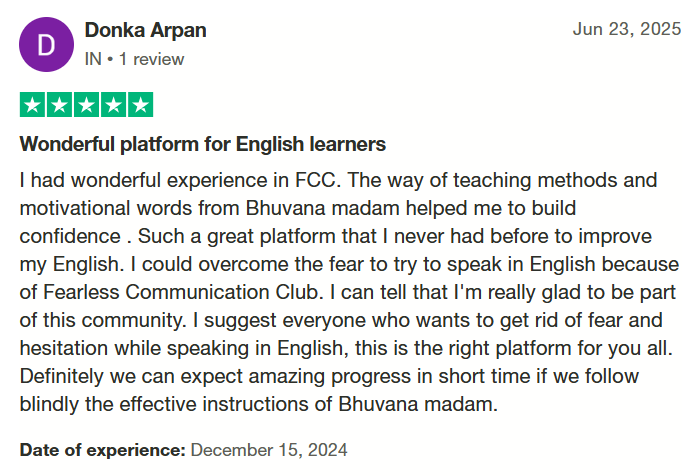 Hello, I’m Bhuvana, the creator of the Fearless Communication Club. My mission? To empower Telugu-speaking professionals like you to speak English confidently, naturally, and effortlessly — without the stress of boring grammar drills, tedious translation, or outdated methods.